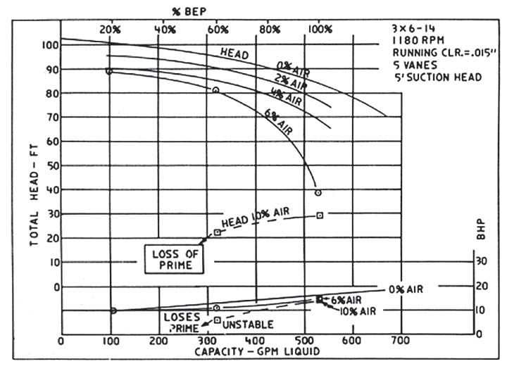 隨著氣體百分比的�(jìn)一步增加,性能開始迅速惡化,直到泵變得不�(wěn)定并失去啟動(dòng)。增加葉輪和泵殼之間的運(yùn)行間隙(0.004 � 0.008 毫米)允許額外的泄漏,這可能有助于防止在較高氣體濃度下的填料損失�