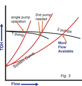 在任何給定的總動�(tài)揚程 (TDH) 下,并聯(lián)運行的兩個相同的泵能夠產(chǎn)生兩倍于單個泵的流量。然而,系統(tǒng)中實�(xiàn)的實際流量取決于系統(tǒng)曲線與泵曲線的交點。除非系�(tǒng)曲線是可變的,否則流量增加可能不會那么顯著�