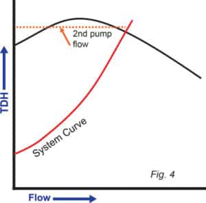 在圖 4 中,系統(tǒng)曲線� TDH 曲線在大于關(guān)� TDH 值的 TDH 和低于曲線的最� TDH � TDH 處相交。當?shù)诙€泵啟動時,流量將僅增加� TDH 與系�(tǒng)壓力匹配的第一個點�