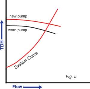 當一個泵磨損時,可能會出�(xiàn)類似的情況。這在� 5 中有所提及。隨著泵的磨損,在任何給定流速下�(chǎn)生的 TDH 量都會減少。如果新泵與系統(tǒng)曲線的交點并�(lián)在磨損泵的關(guān)閉TDH之上,它將迫使磨損泵進入�(guān)閉狀�(tài)�