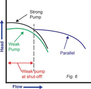 如果一個泵表現(xiàn)出較低的�(guān)� TDH 特性,它將在關(guān)閉狀�(tài)下運行,直到主導(dǎo)泵在其曲線上移動足夠遠,以至于其 TDH 低于具有較低揚程的泵的關(guān)� TDH(圖 5 )�